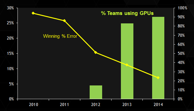 ImageNet挑战赛:使用GPU的获胜误差和百分比。图源:英伟达