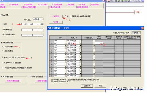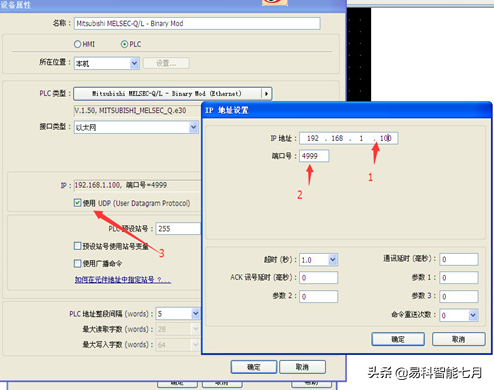 L02CPU的参数设置,只针对自身设置,1是IP地址设置与触摸屏哪里一样192.168.1.100,2协议选择UDP、打开方式选择MC协议、然后就是端口号设置为4999