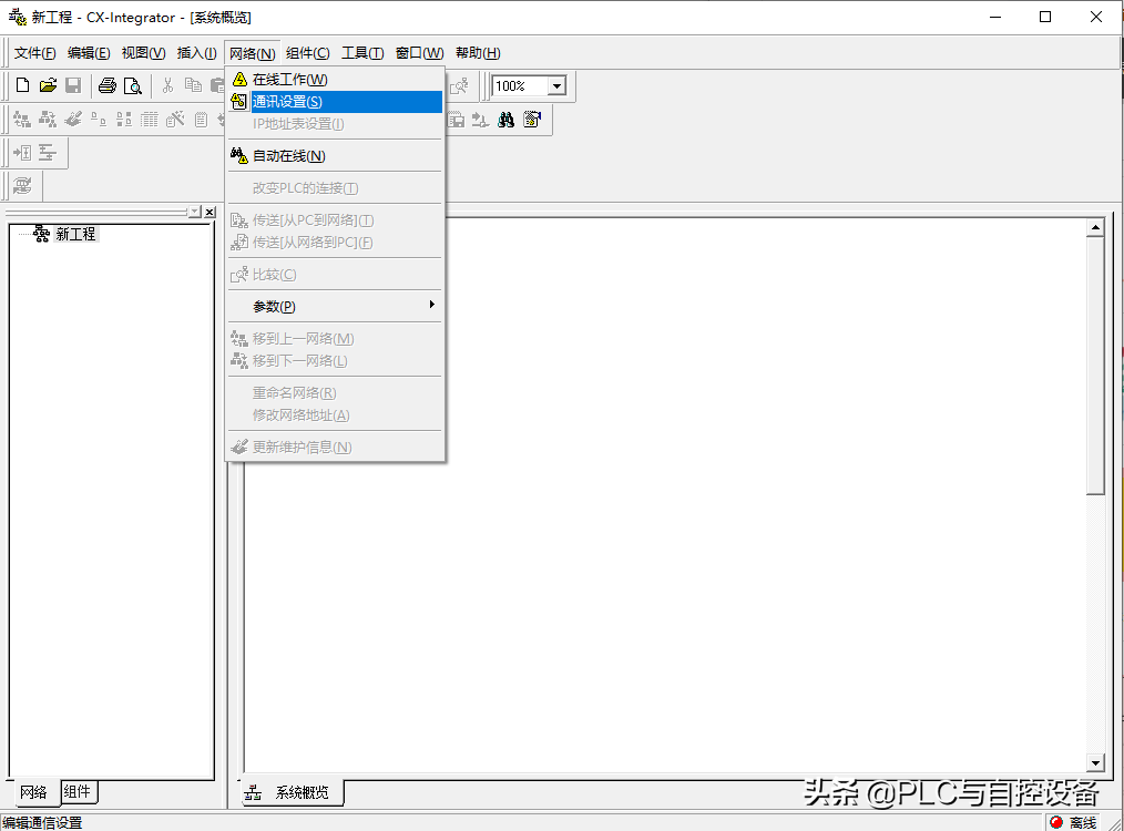 打开CX-Integrator软件,新建一个工程,在网络菜单下,选择“通信设置”,设置目标PLC的类型和网络类型。