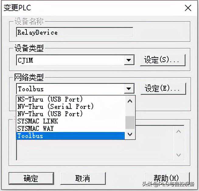 设备类型设定为“CJ1M”,旁边按钮设定CPU的类型;网络类型设定为“Toolbus”,旁边按钮设定通信的端口和波特率。