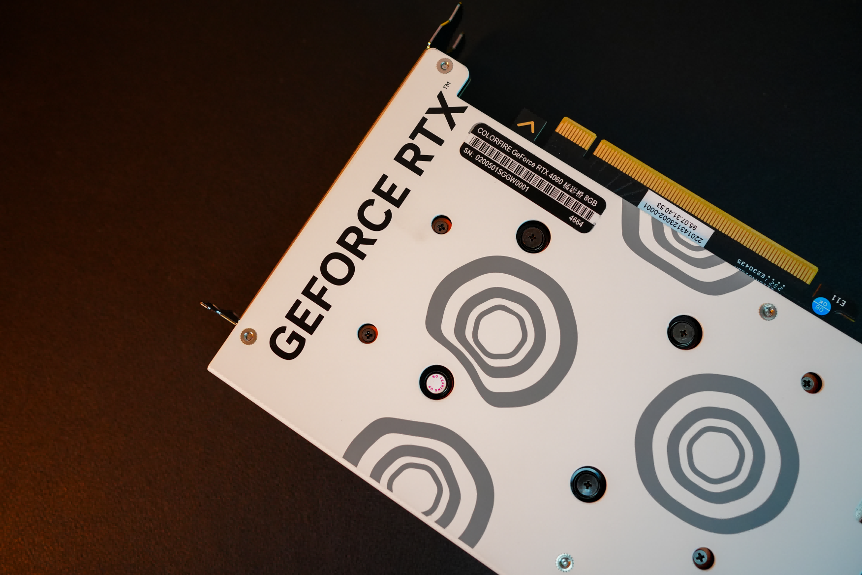 COLORFIRERTX4060橘影橙8GB的背板设计比较简约,加固背板可以有效避免显卡过重导致PCB板弯曲。背板镂空的设计,可以前后通风,加速GPU降温。而一圈圈灰色的圆圈图案其实是橘猫子啊走过积水地面时产生的涟漪,真是细节满满。