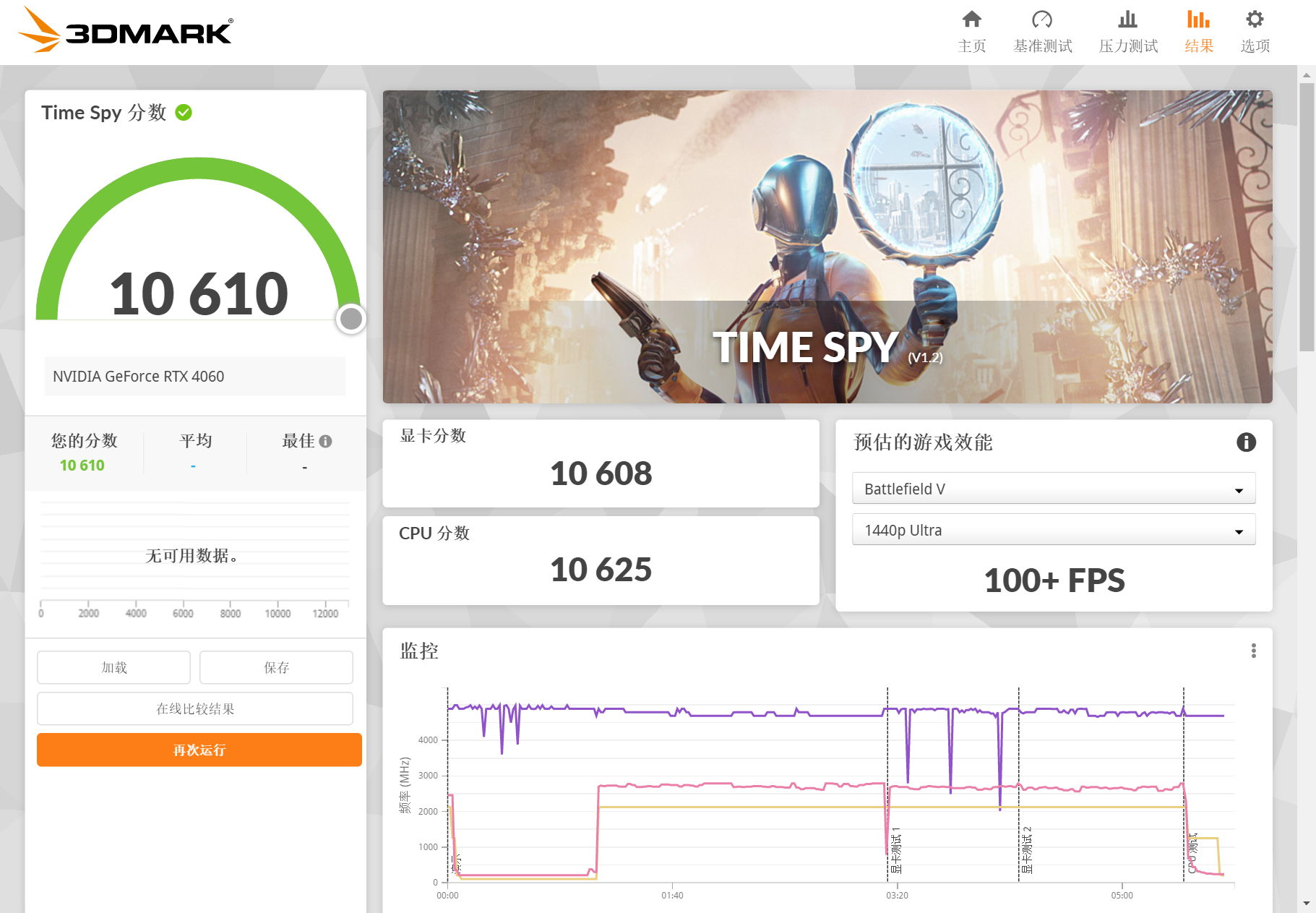 在3DMARKTimeSpy中,COLORFIRERTX4060橘影橙8GB的显卡总分为10610分,显卡得分为10608分。