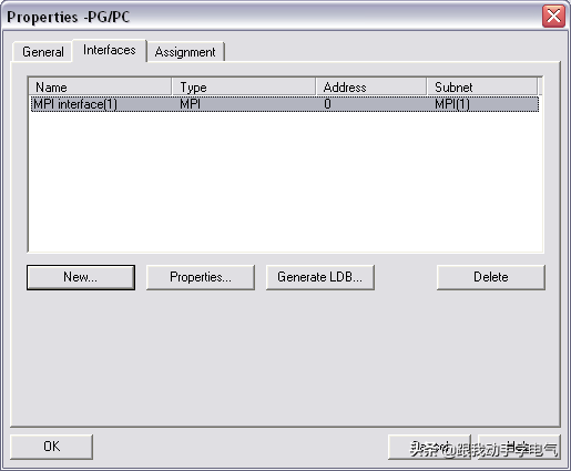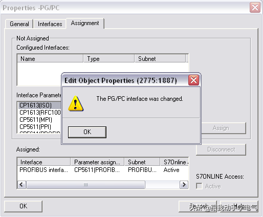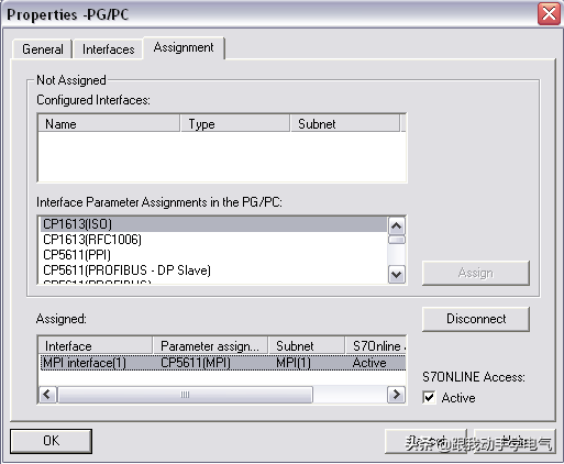 3.3.5选择Assignment选项卡,在接口参数分配列表中选择实际使用的硬件设备,单击右侧的分配按钮,然后单击OK按钮,完成对PG/PC的组态,如图19所示: