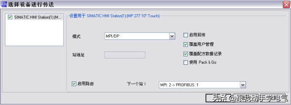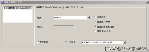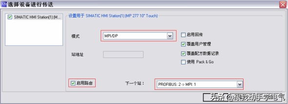 在WinCCflexible的传送设置中同样选择MPI/DP的模式,勾选“启用路由”复选框,路由方式为:从地址为2的MPI网络路由到地址为1的PROFIBUS网络,如图14所示: