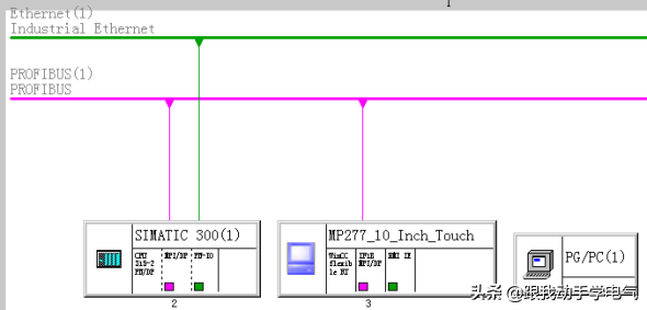 3.3.2将硬件组态进行下载,打开NetPro,插入PG/PC和SIMATICHMIStation,设备类型选择MP27710”Touch。将MP277的1F1B口挂入DP网,设置其DP地址为3如图16所示: