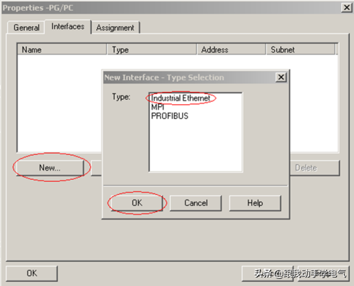 3.3.3双击PG/PC,打开其属性对话框,选择接口选项卡,单击新建按钮,在弹出的对话框中选择IndustrialEthernet,单击OK按钮,如图17所示: