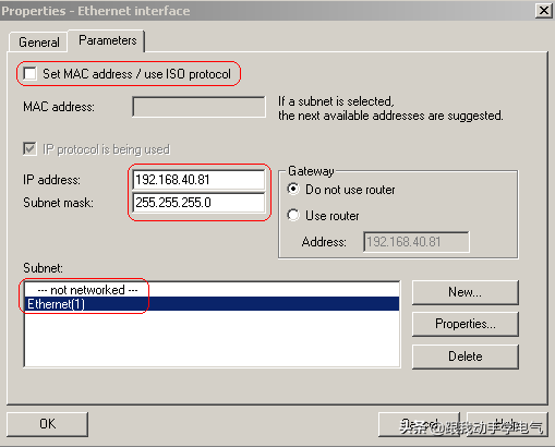 3.3.4在弹出的参数设置对话框中,取消使用ISO协议的选项,选中Ethernet(1),将IP地址设置成本地计算机的IP地址,单击OK按钮,如图18所示: