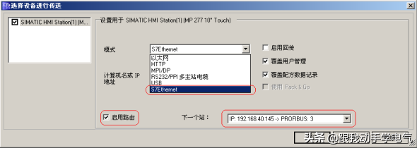 3.3.10打开传送设置对话框,模式选择S7Ethernet,勾选左下角的“启用路由”复选框,可以看到右侧有路由的路径显示,如图25所示: