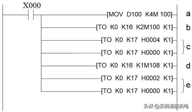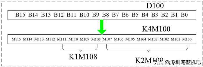 a:数字数据D100扩展到辅助继电器(M100~M115),K4M100表示M100~M115,k1表示连续4个M,例如下面的K2M100就表示M100~M107。(为什么要用M来表示D呢,因为我只转换12位,D是16位的)