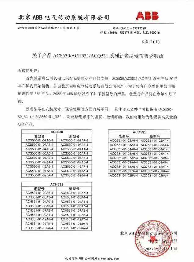 关于以上ABB传动系列停产型号及对标替换型号的详细说明,请参考以下官方正式通知函。