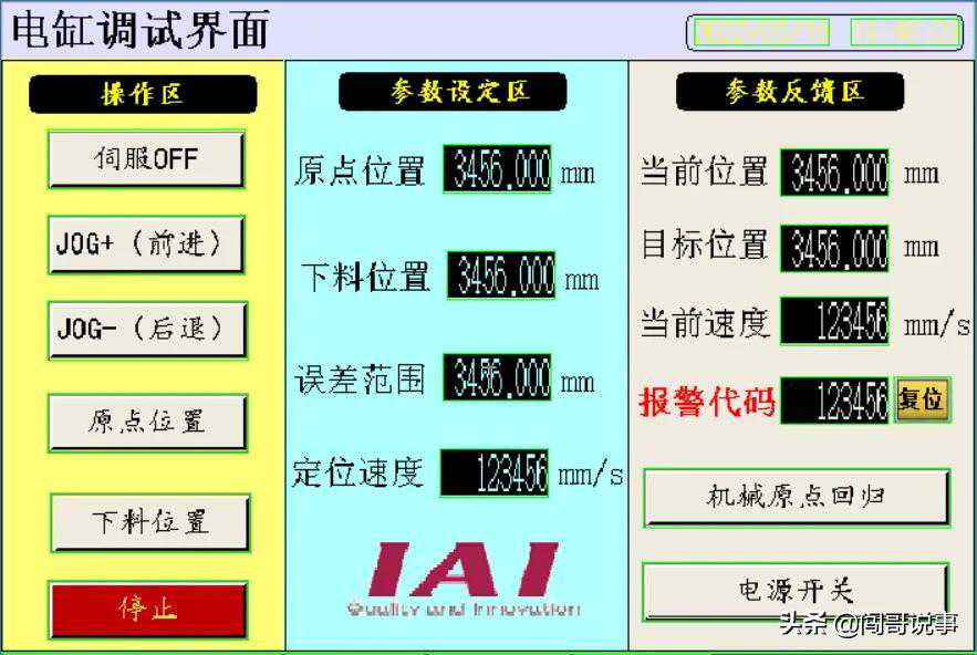 ①.操作区:伺服上电、JOG、停止、报警复位等。