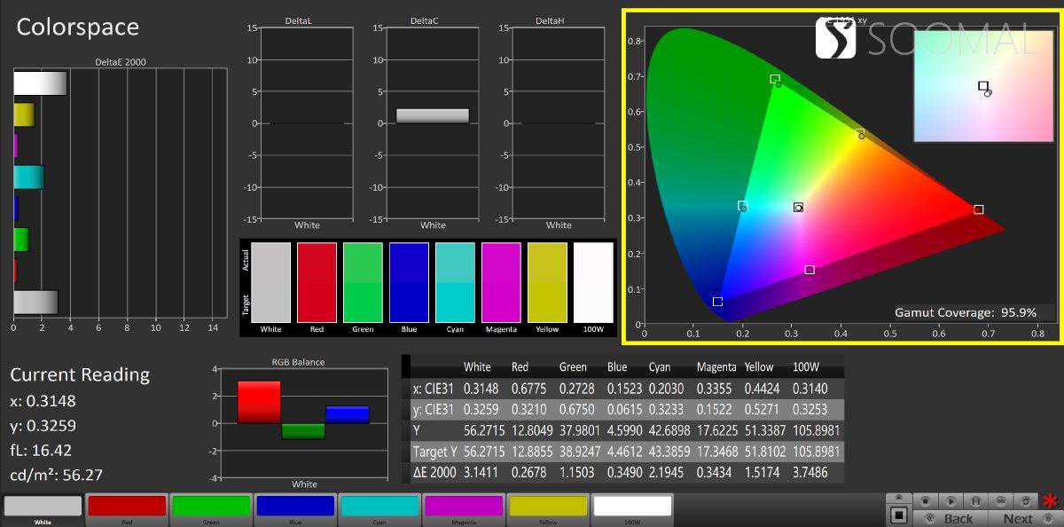 专业色彩:Ace3的专业模式实测色温为6492K,GAMMA值实测2.19,灰阶平均偏离值2.6。sRGB色域覆盖率97.9%,因为绿点位于域内,这也影响覆盖率,sRGB下的平均色偏为1.6,最大偏离值4。P3色域覆盖率95.9%,平均色偏1.5,最大色偏3.8。