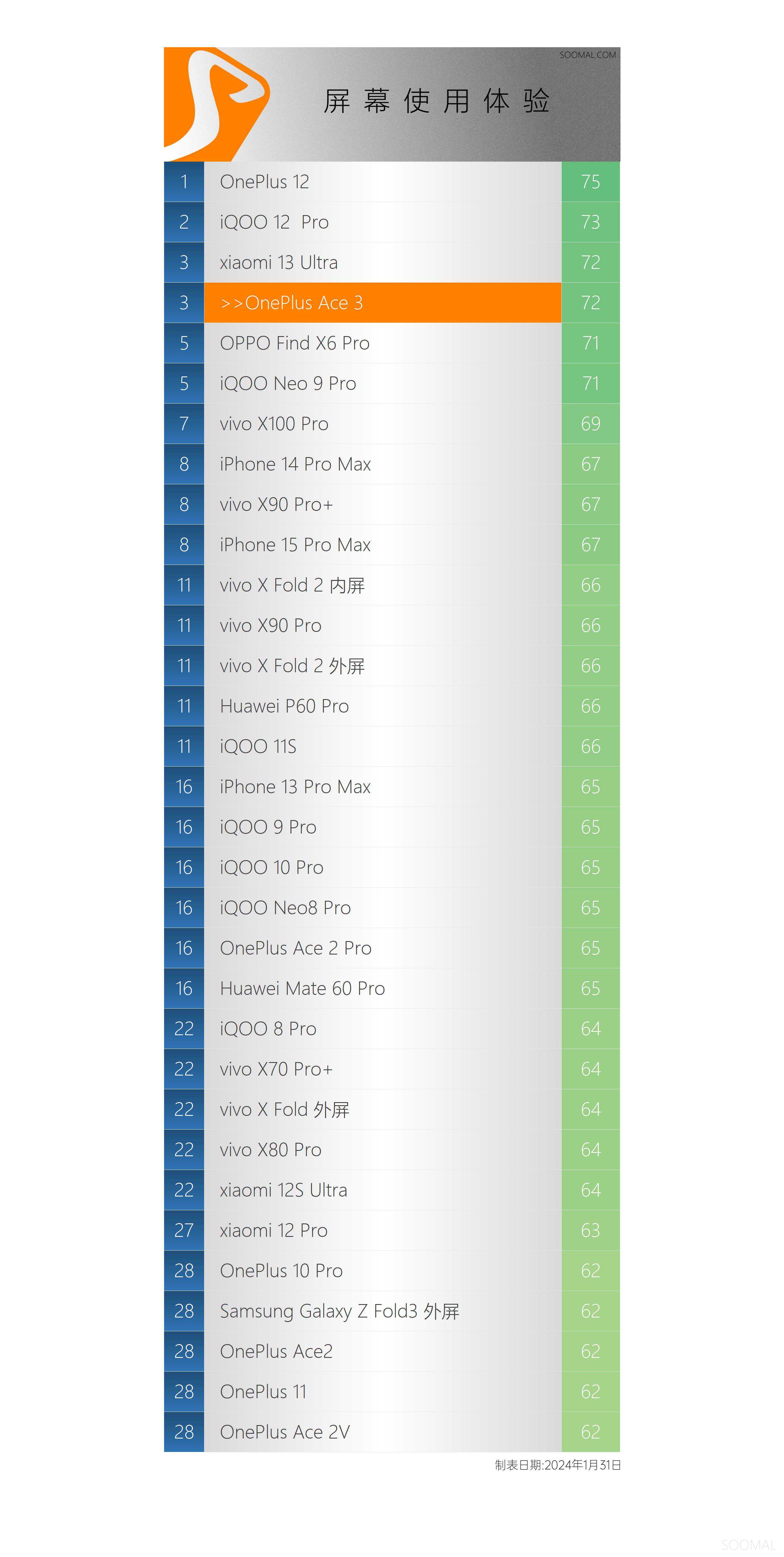 SOOMAL屏幕使用体验排行榜[2024年1月31日]
