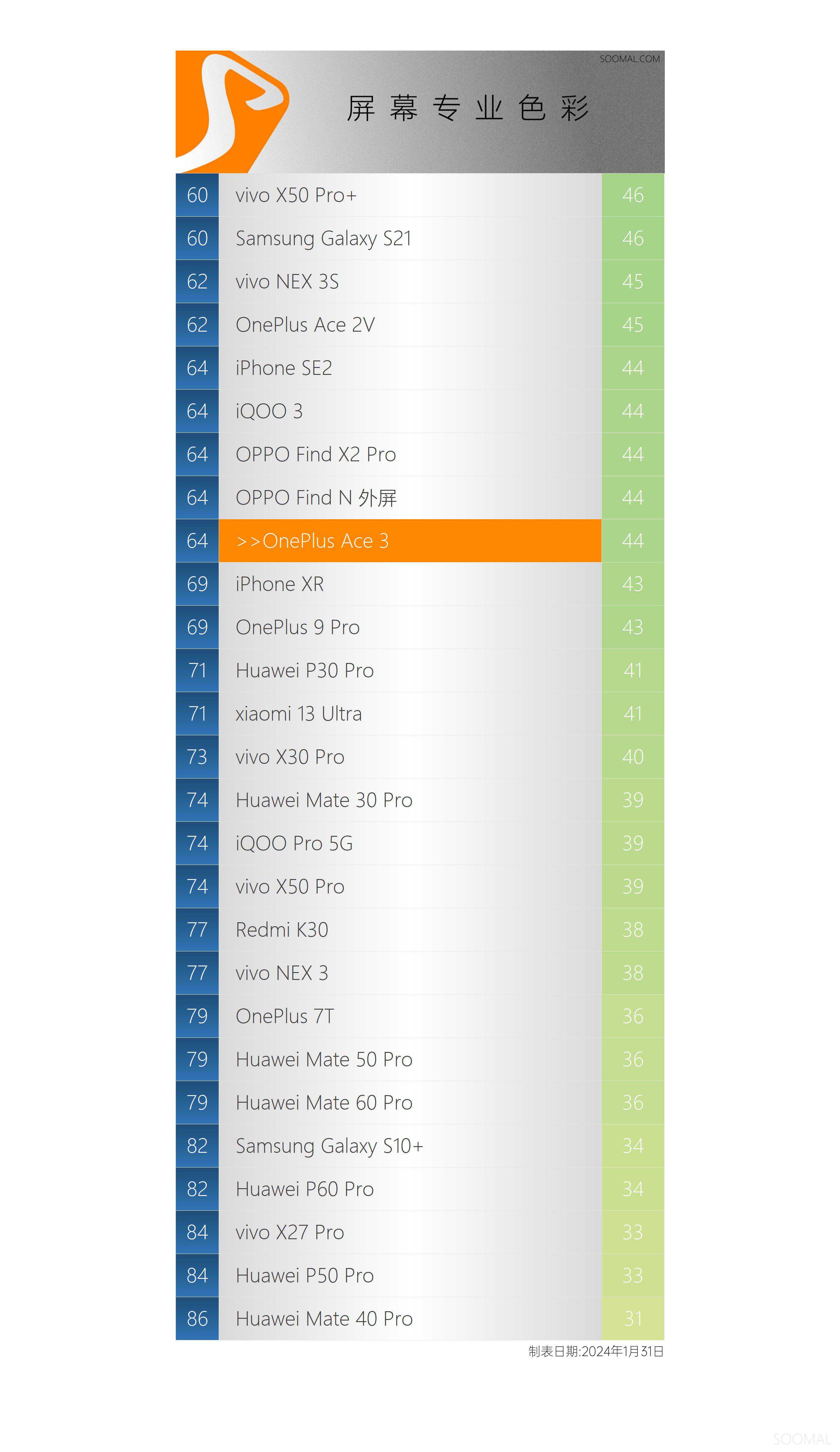 SOOMAL屏幕专业色彩排行榜[2024年1月31日]