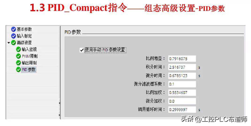 S7-1200CPU提供了PID控制器回路数量受到CPU的工作内存及支持DB块数量限制。严格上说并没有限制具体数量,但实际应用推荐客户不要超过16路PID回路。可同时进行回路控制,用户可手动调试参数,也可使用自整定功能,提供了两种自整定方式由PID控制器自动调试参数。另外STEP7Basic还提供了调试面板,用户可以直观的了解控制器及被控对象的状态。PID控制器功能主要依靠三部分实现,循环中断块,PID指令块,工艺对象背景数据块。用户在调用PID指令块时需要定义其背景数据块,而此背景数据块需要在工艺对象中添加,称为工艺对象背景数据块。PID指令块与其相对应的的工艺对象背景数据块组合使用,形成完整的PID控制器。自软件博途V13起,固件为4.0或更高版本的S7-1200,可以使用PID_指令。S7-1200在以上,博途V13SP1以上,使用S7-PLCSIMV13SP1可以仿真PLC程序,但不支持工艺功能(高速计数器、运动控制、PID调节)的仿真。