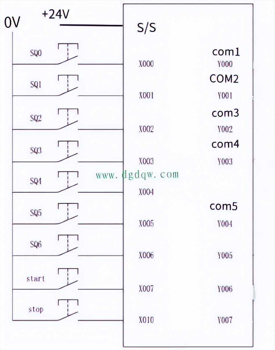 FX3SA-20MTPLC的输出端分为五组,com1与Y0、com2与Y1、com3与Y2、com4与Y3、com5与Y4-Y7,com5是Y4-Y7的公共端。这些公共端与对应的输出端之间形成开关关系。当PLC输出信号时,对应的指示灯亮,公共端与输出端导通,从而输出+24V信号。此外,FX3SA-20MT为晶体管输出,响应速度较快,可以输出脉冲信号,适用于控制步进电机与伺服电机等设备。