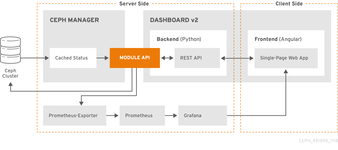 现在的CephDashboard后端代码使用CherryPy框架和自定义RESTAPI实现。WebUI基于Angular实现。