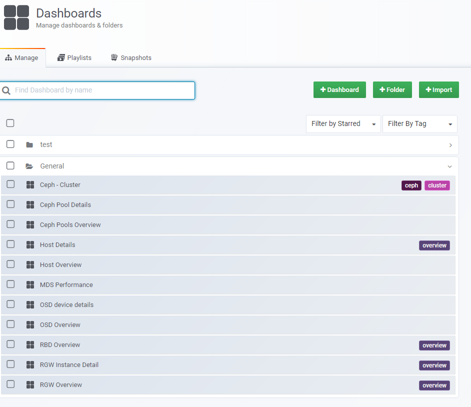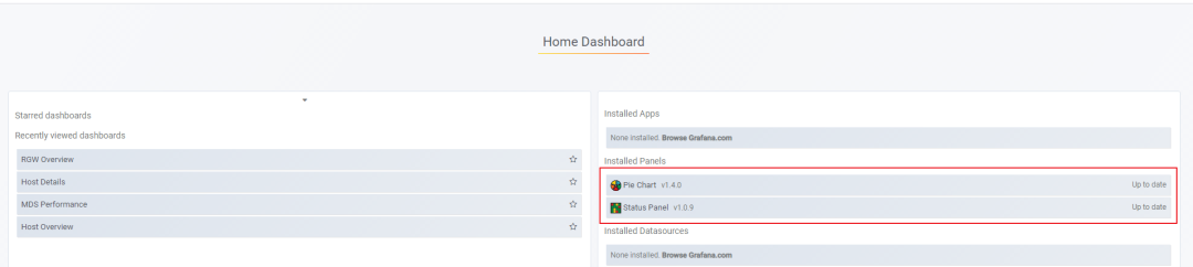 导入cephdashboardgrafana插件,有两种方式可以导入dashboard,一是github地址直接下载并导入,二是本地导入,其实在安装Dashboard的时候就会自动安装cephdashboardgrafana插件了。