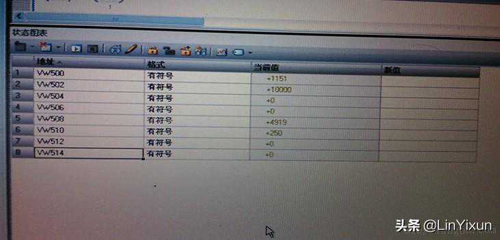 转速输入:在状态图表中地址栏输入VW502,输入0~20000的值后,写入。这样变频器的转速会根据输入值的改变而改变;同样,如果想要监控变频器中实际运行参数,可以在状态图表中地址栏输入VW508,VW510,这样就可以显示相对应的参数值了(如图)。