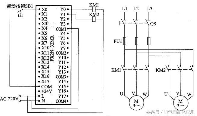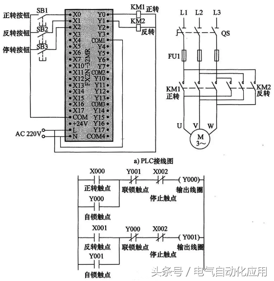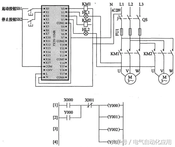 图1采用线圈驱动指令实现起动、自锁和停止控制的PLC线路与梯形图