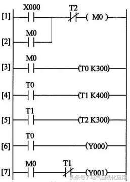 图6一种典型的多定时器组合控制的PLC线路与梯形图