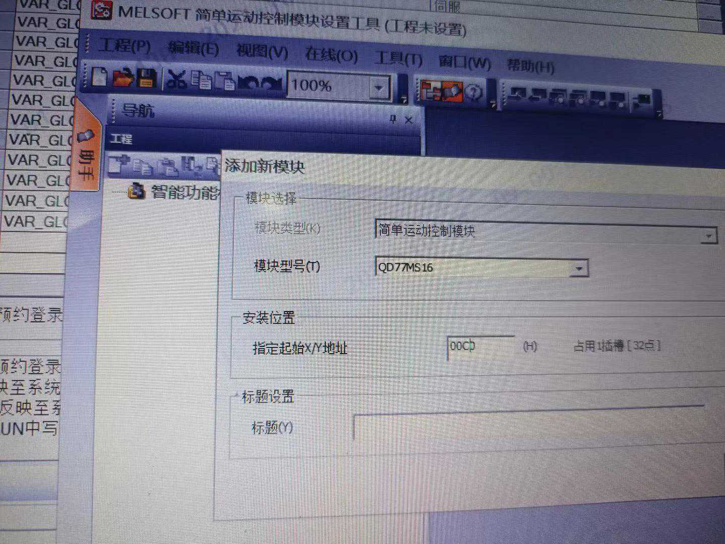 在三菱work2软件中导航列表选择智能功能模块,进入简单伺服运动控制模块设置处。在里边添加新模块,填入选择的运动控制模块模块型号和起始Xy地址(此为我们在Plc中已分配好给Qd77MS16运动控制模块......