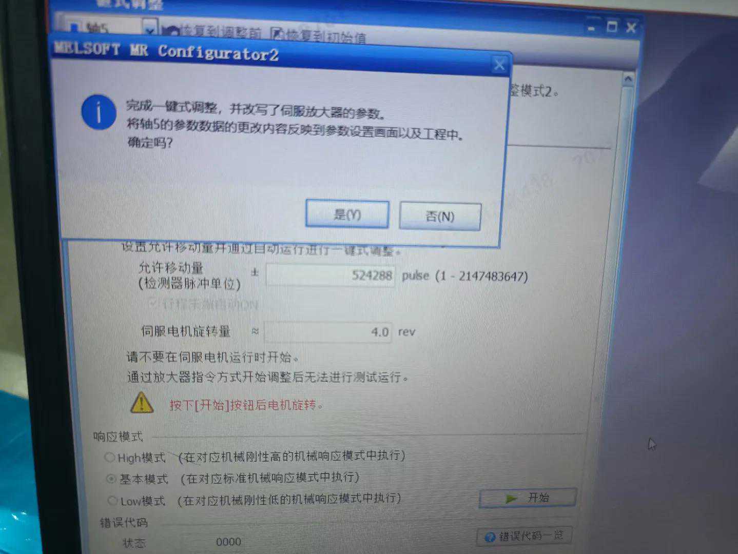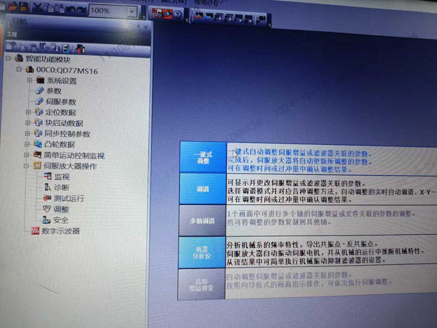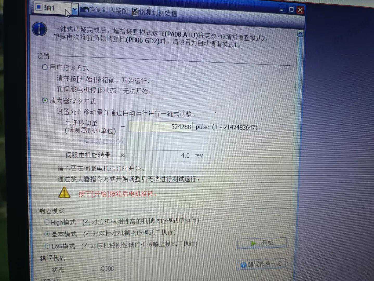 读取后在左边导航伺服放大器操作的调整下进行一键式调整,选择轴和放大器指令方式和基本模式后开始。