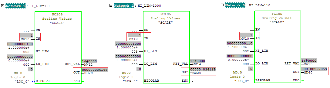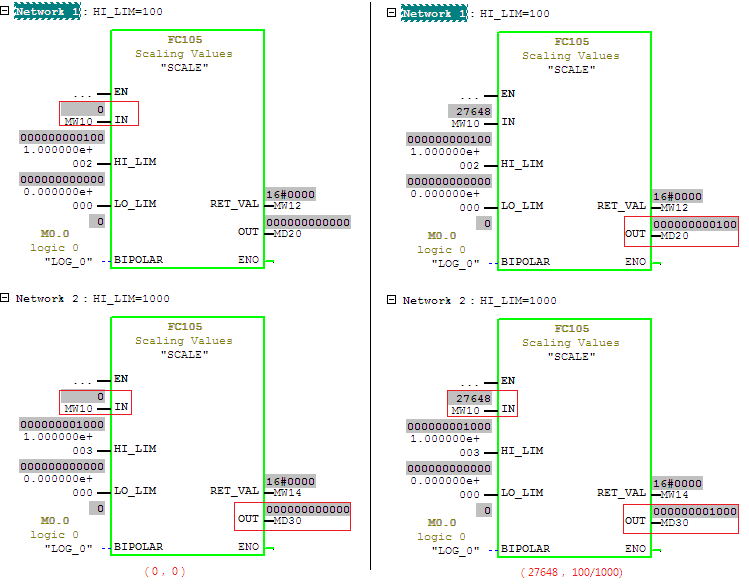 可见,HI_LIM、LO_LIM定义了FC105输出端OUT输出值的范围,在BIPOLAR=0时,输入端(0,27648)这个范围的值将被转换成实数,并“压缩”到(LO_LIM,HI_LIM)的范围内;同理,BIPOLAR=1时,将输入端范围(-27648,27648)的值“压缩”到(LO_LIM,HI_LIM)的范围内。
