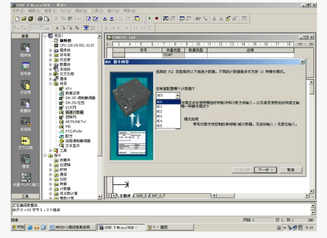 高速计数器的编程方法有两种,一是采用梯形图或语句表进行正常编程,二是通过STEP7-Micro/WIN编程软件进行引导式编程。不论那一种方法,都先要根据计数输入信号的形式与要求确定计数模式;然后选择计数器编号,确定输入地址。