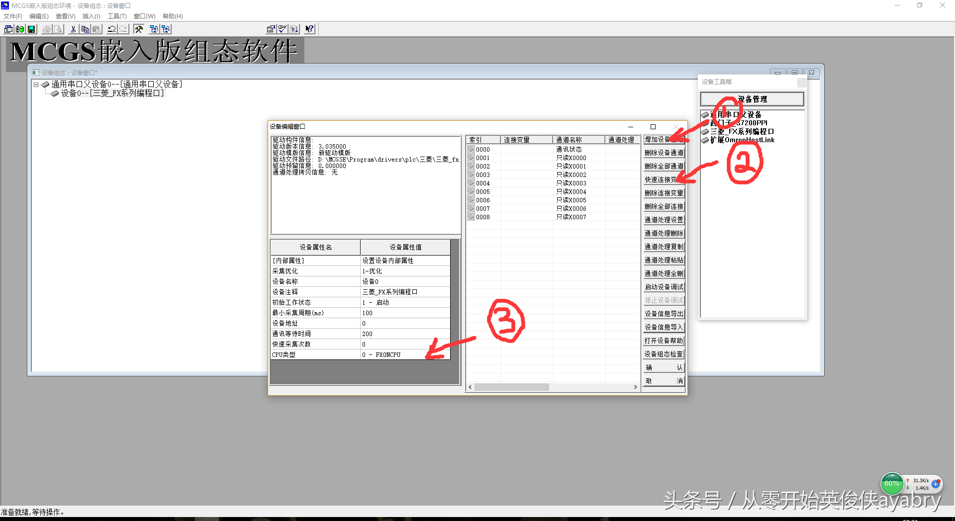 双击设备窗口→选择菜单工具栏中的工具箱→双击通用父设备→双击三菱编程口→弹出对话框点选“是”