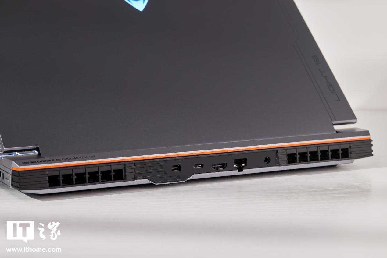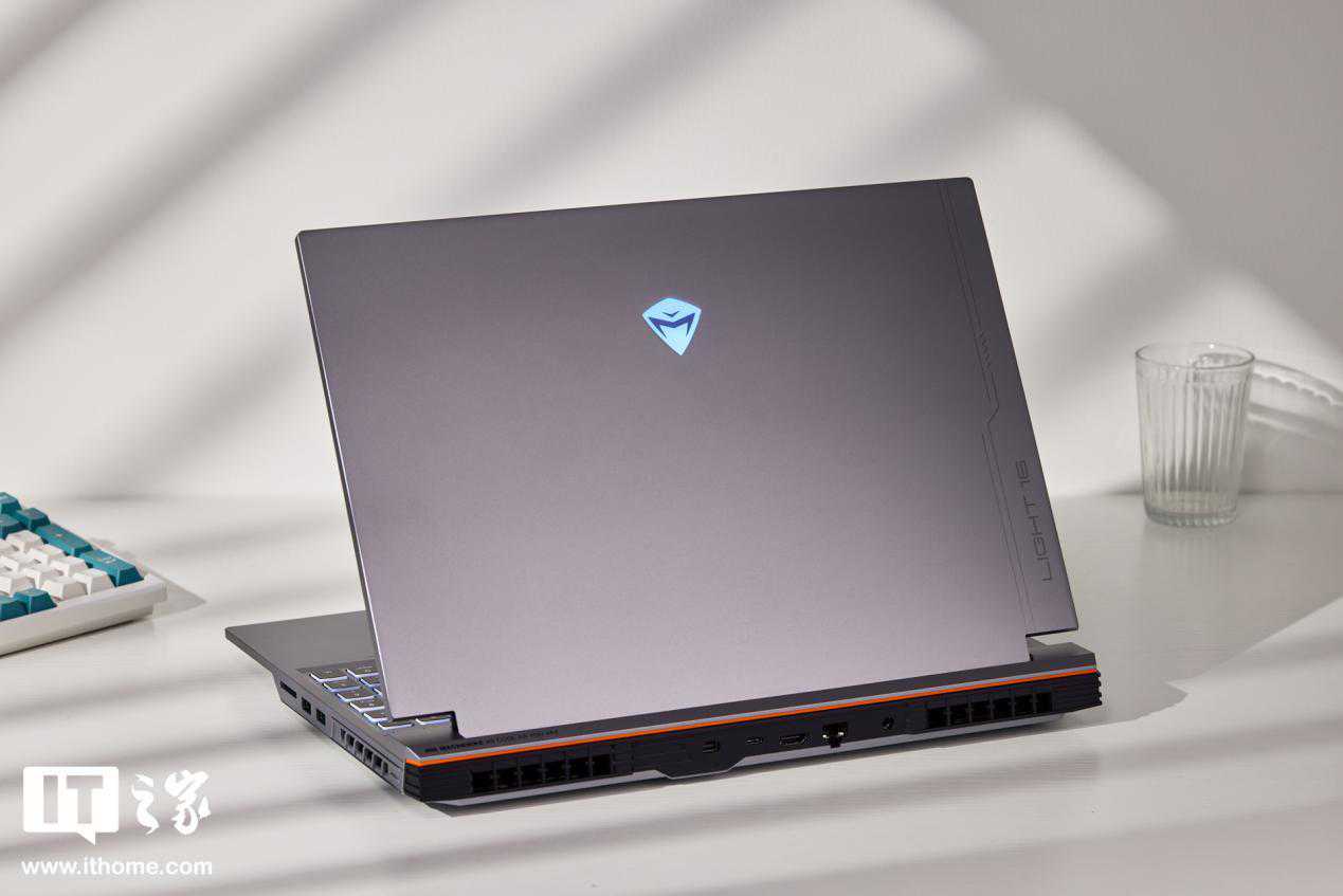 IT之家拿到的这款笔记本,主色调为灰色,A壳材质为航空铝轻材,并经过喷砂、阳极、氧化等工艺,给人带来成熟、不张扬的感觉。笔记本A面为纯平设计,没有掺杂太多线条与电竞图案元素,居中Logo支持RGB多色调节,另外还在机身右侧加入“Light16”产品型号标识,简洁的同时也让机身外观设计不像商务本那样稳重、单调。