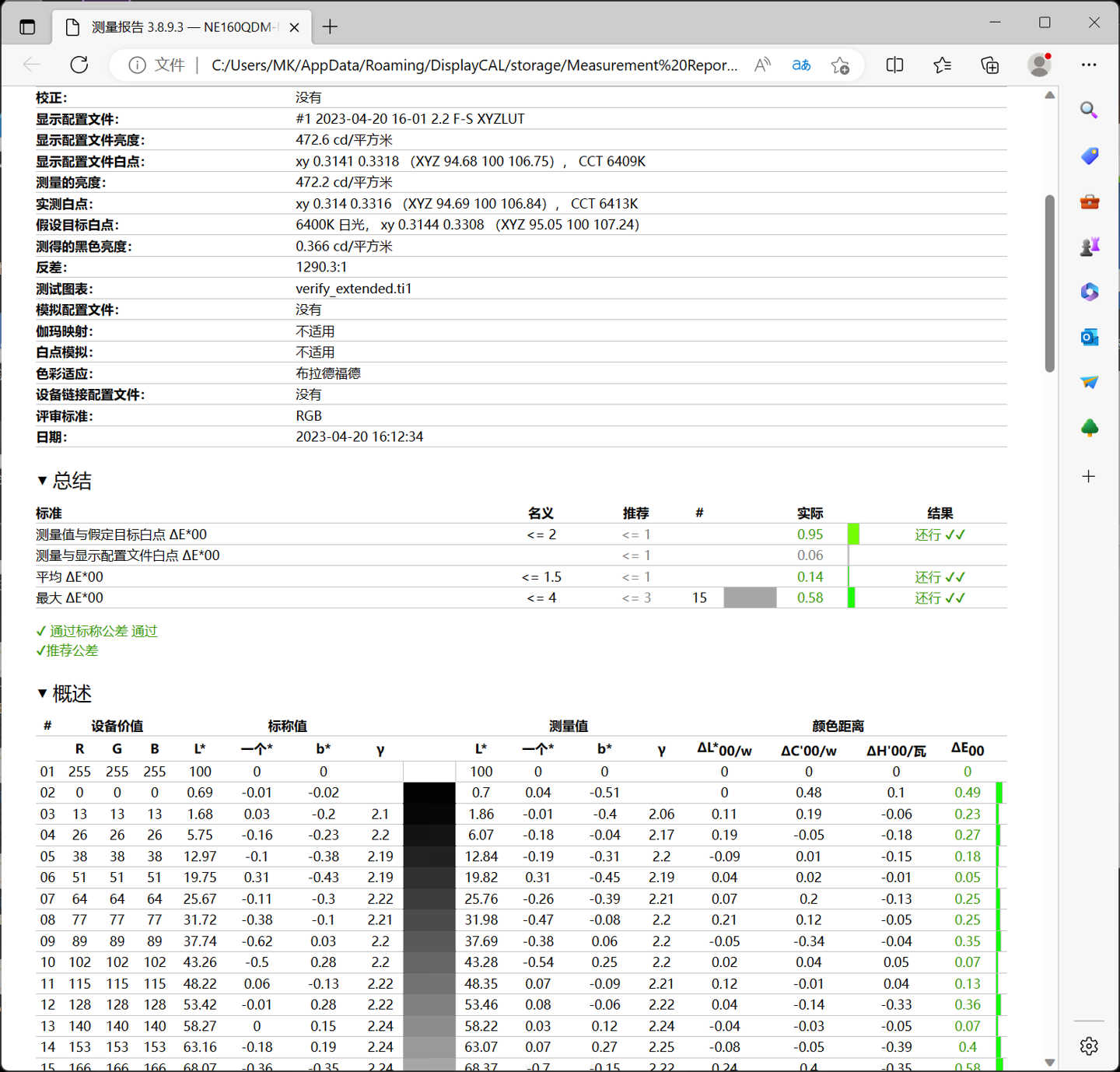 色准方面,平均△E为0.14,多种色彩均未出现明显偏色情况,色彩显示准确。
