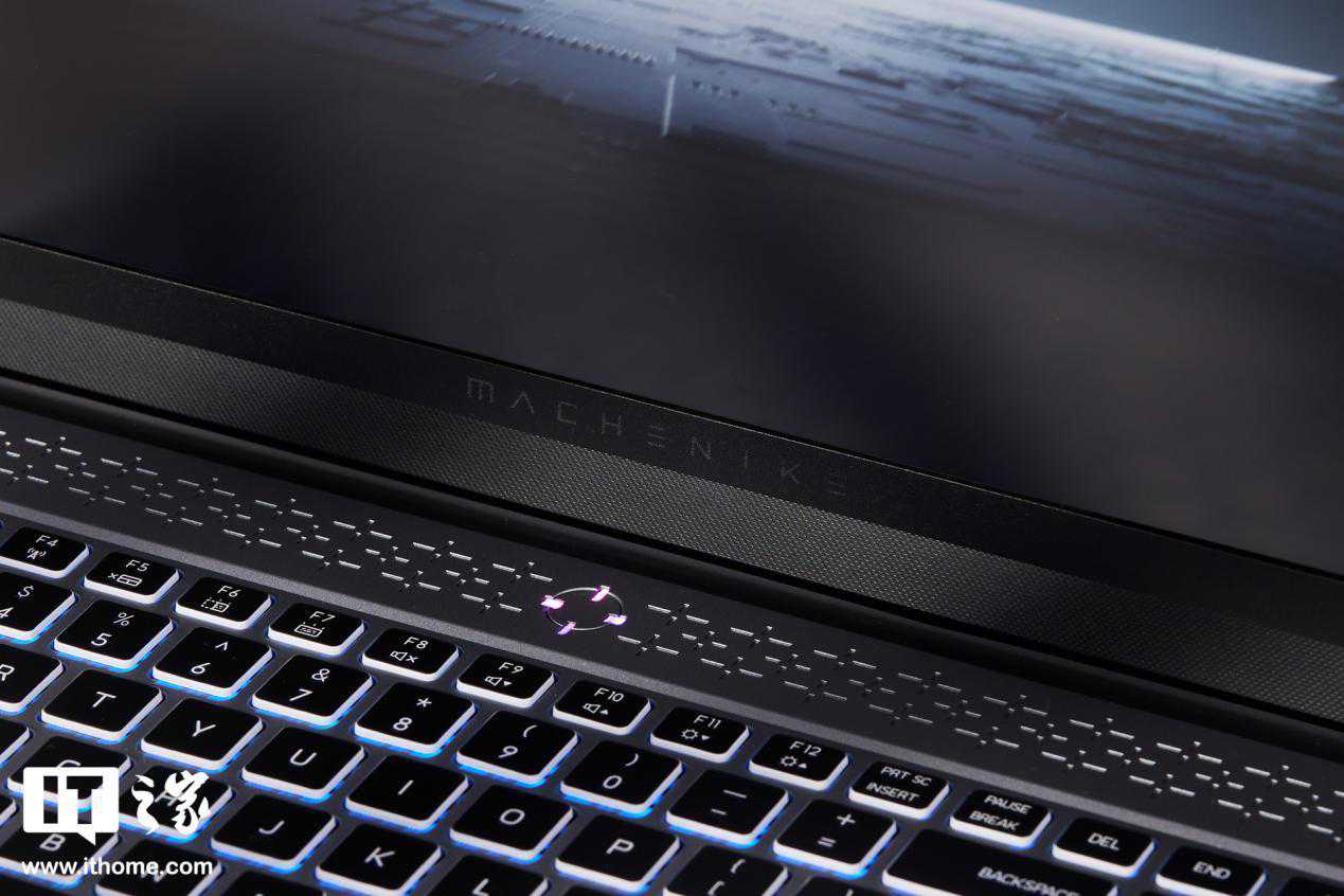 电源键位于键盘区域上方,电源键灯光为准星样式,灯光颜色可随性能模式切换,便于快速判断笔记本所处性能模式。