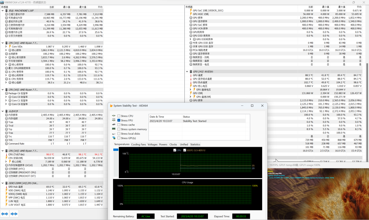 在对笔记本双烤测试中,IT之家同时运行FurMark与AIDA64单烤FPU,在20分钟双烤测试时间点,CPU功耗定格在56W、98℃,GPU定格在131W、88.5℃,相对单烤显卡成绩,GPU功耗水平损失不大,整机性能释放大约为187W,对于一台笔记本来说,是一个非常优秀的成绩。