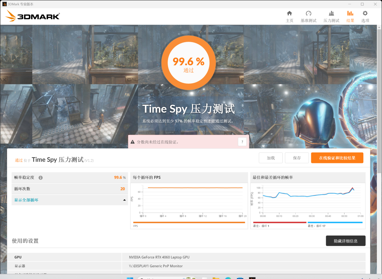 TimeSpy压力测试最终成绩99.6%,完美通过。