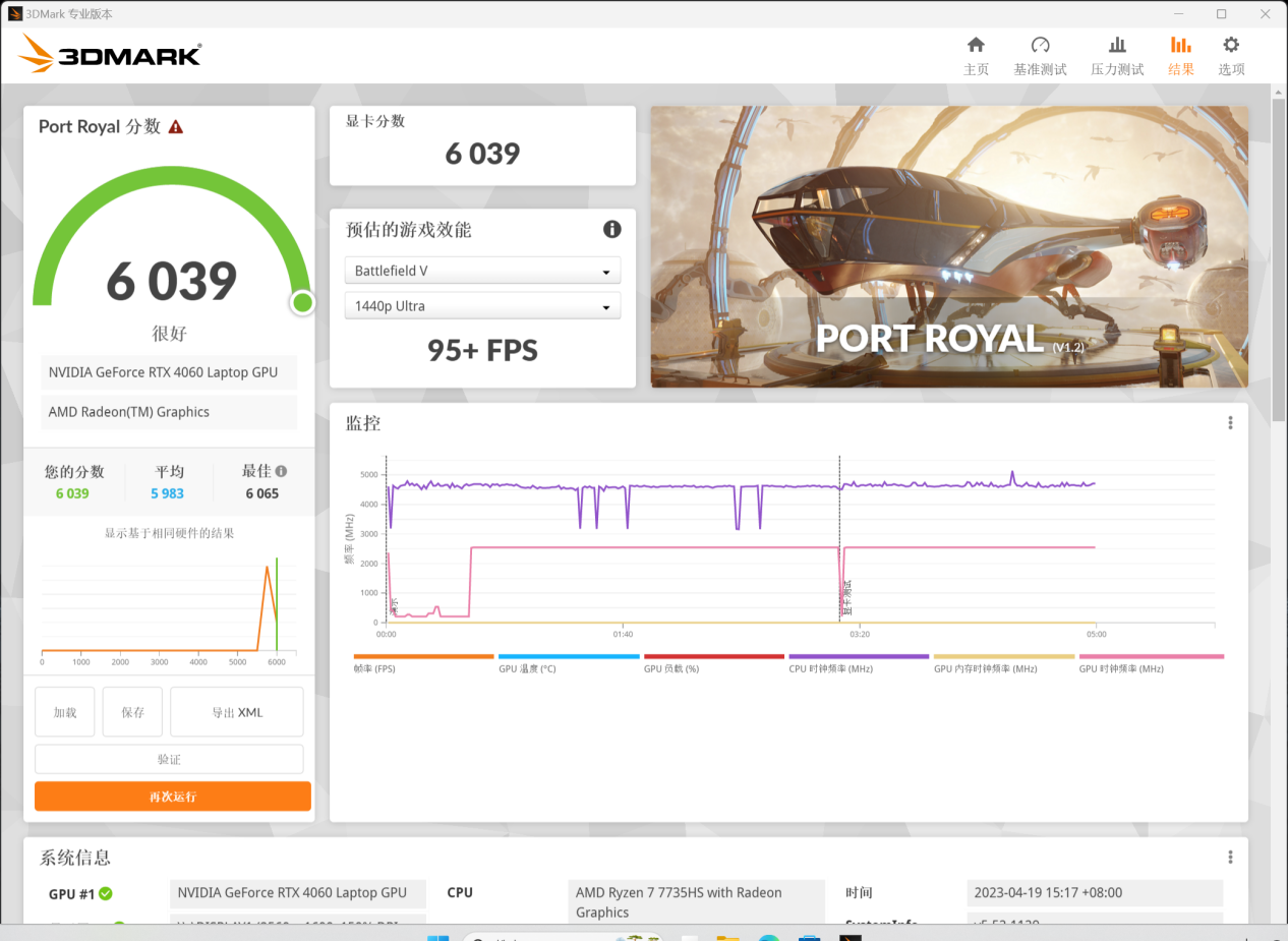 另外在3DMarkPortRoyal光追测试中,这枚RTX4060获得6039分,从客观角度印证这枚显卡在光追场景下的实力。