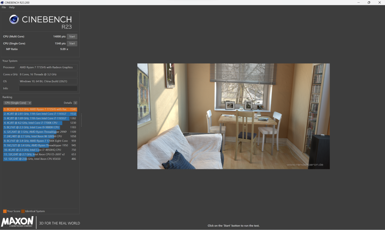 代表CPU理论性能的R23中,这枚Ryzen77735H收获单核1540分和多核14000分的成绩。
