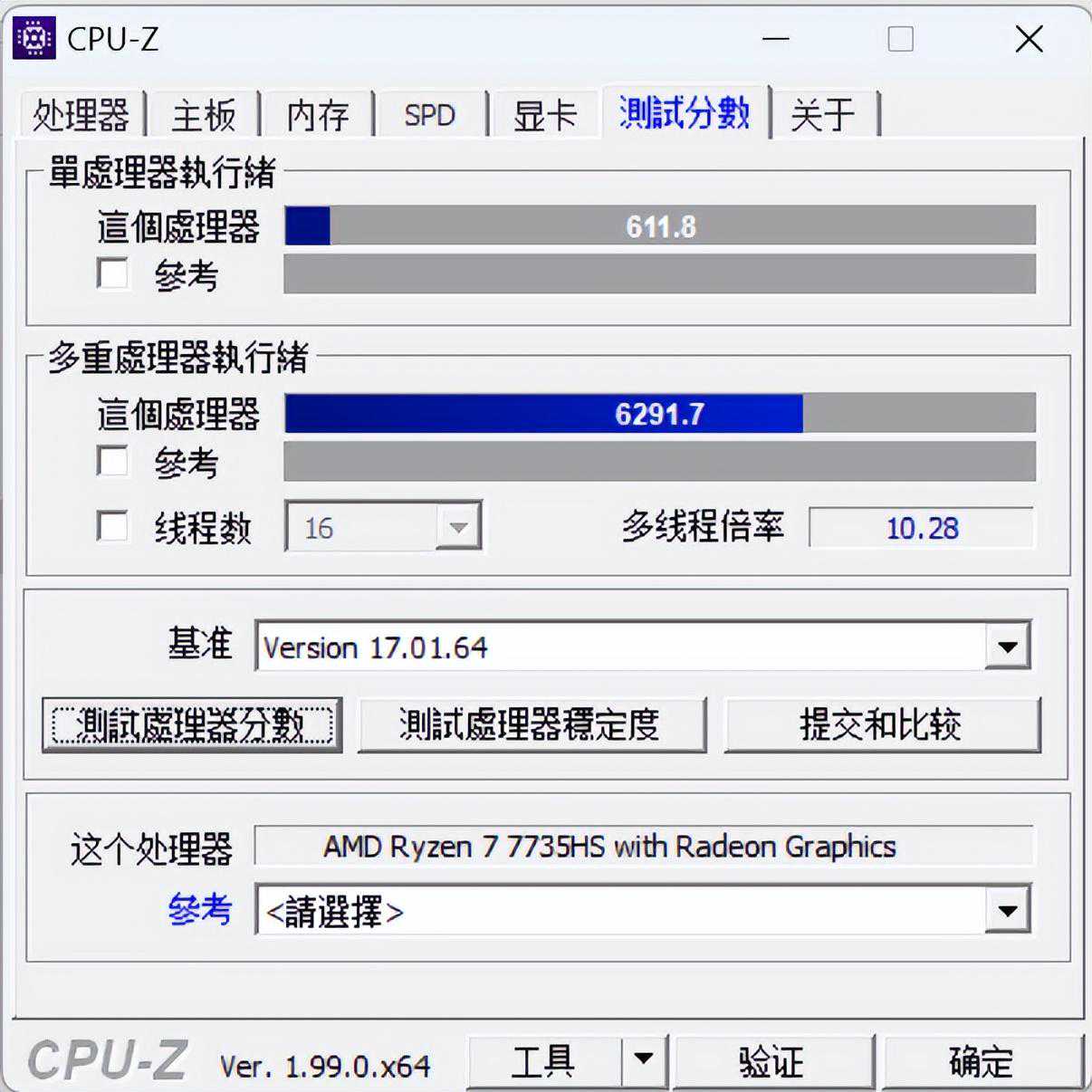 CPU-Z测试分数单核成绩611.8,多核分数6291.7。