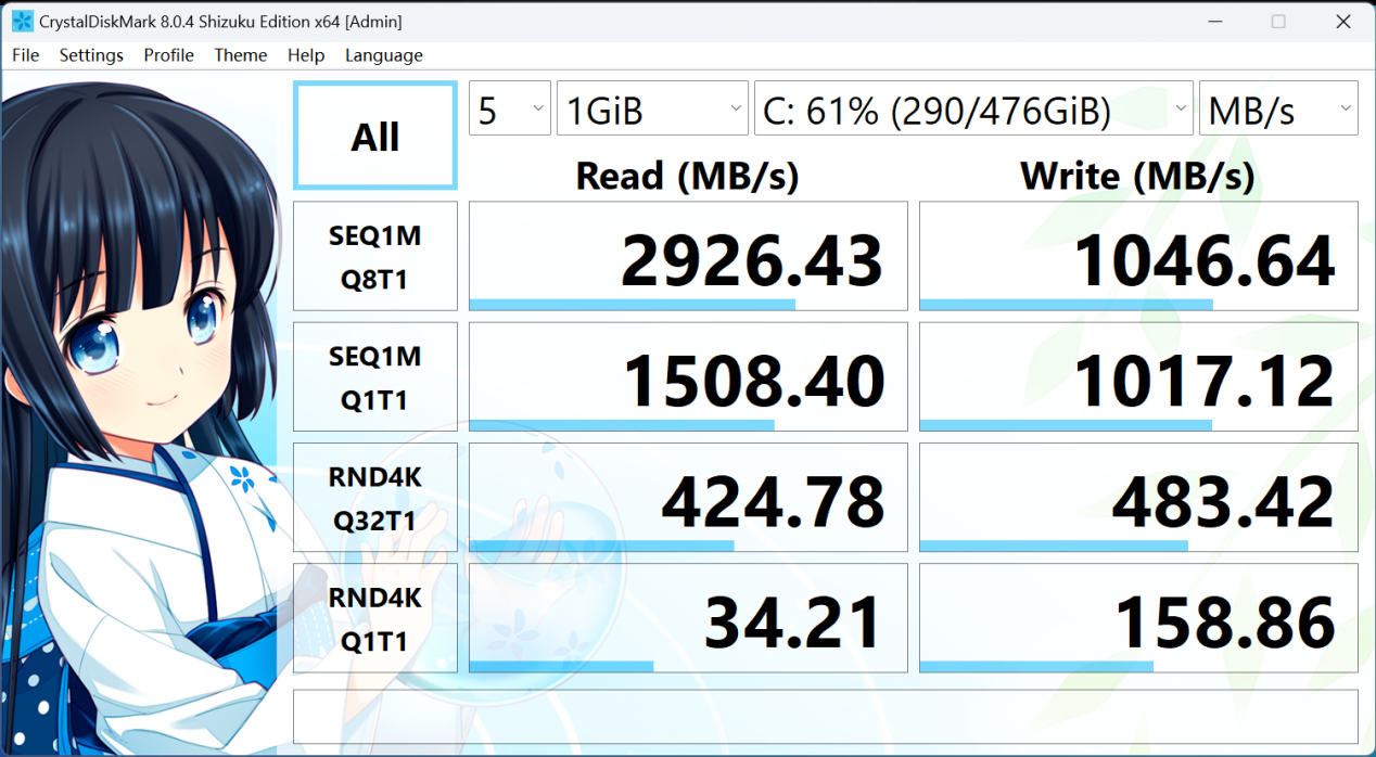 512固态硬盘性能上最快读取以及写入速度分别为2926.43Mb/s、1046.64Mb/s,若不满足512GB存储空间,也可以自行拆机升级。