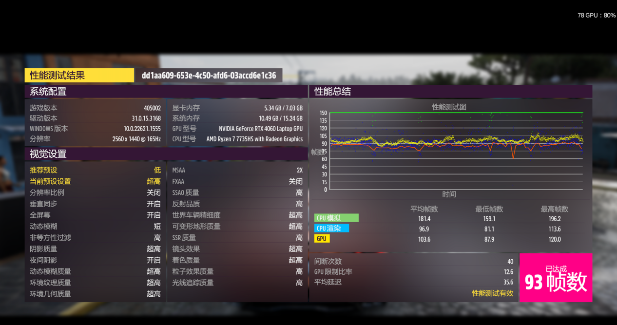 最后是《极限竞速:地平线5》,在开启光追、全高画质,2.5K游戏分辨率下,帧率来到93帧。