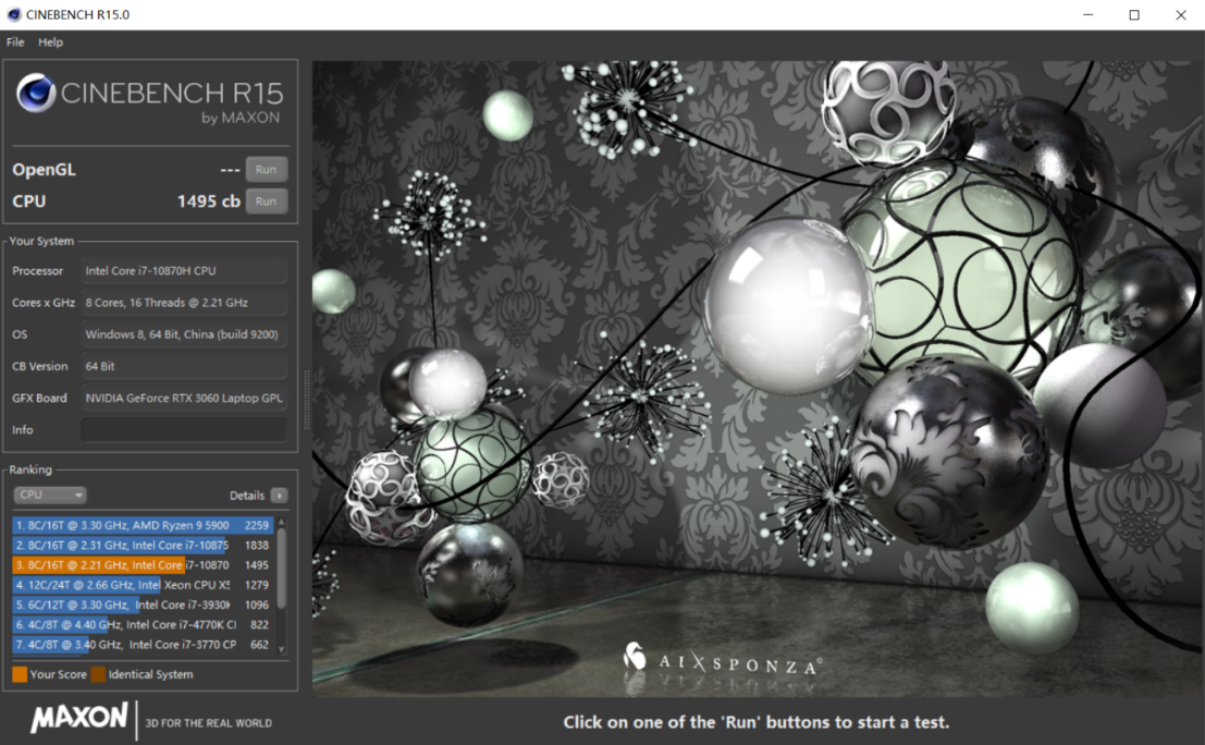首先是代表CPU性能的R15和R20跑分,R15得分1495分,R20得分3444分,均为i7-10870H的正常表现。