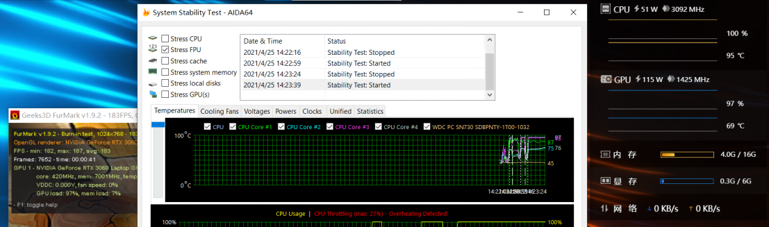 在压力最大的AIDA64FPU+甜甜圈双烤30分钟,显卡功耗会降低到默认115w,此时CPU温度稳定在95℃,显卡温度稳定在69℃,在这种极限环境下冲锋坦克2ProGP66还是发生了一些降频的。不过此时机身温度仍然不是很高,WASD主要操作区温度仅35.8℃,可以舒适地游玩。