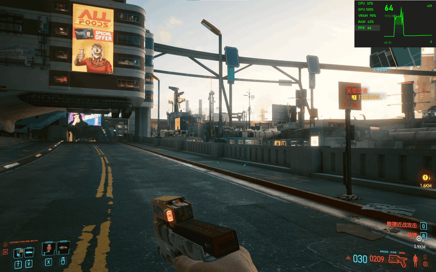 最后一款游戏是《赛博朋克2077》,最高画质下,不开光追帧率可以稳定在60-70帧,游戏体验不错。