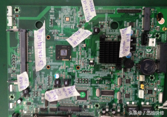 示波器量Q2D级为0V,向前跟查Q2G级为3.3高电平,向前跟到Q1第一脚上只有0.2V电压。主板断电后查它对地值仅为20欧,风枪取下Q1管子,打值仍为20欧,当折下C18电容后,阻值恢复到230欧。补上Q139N04三级管和C18电容后,重新上电主板一路小跑进WIN7系统了,之后花10分钟机器装配OK,来张亮机图: