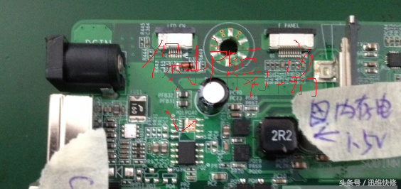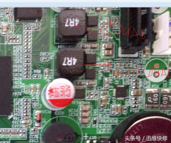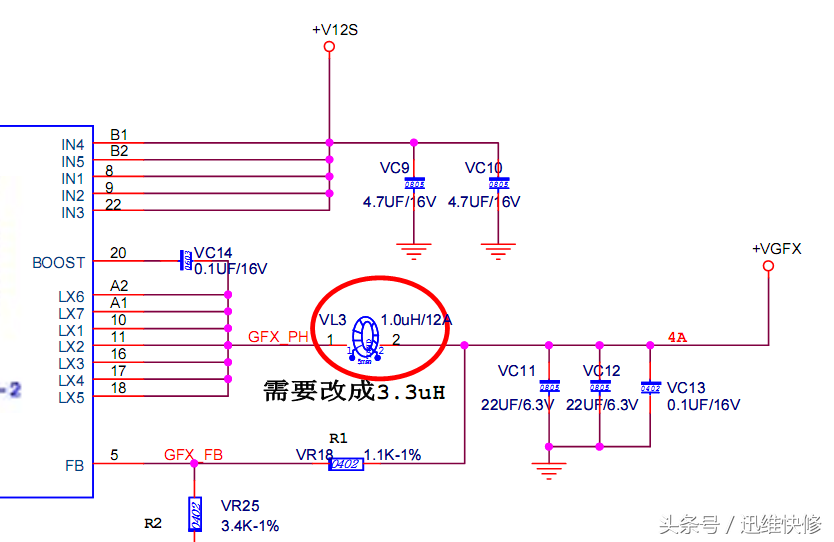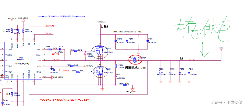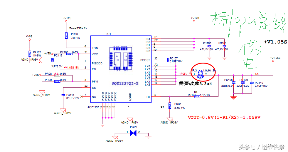 一路飞奔到PL3电感上,示波器量测确实是没有1.05V供电输出了,附实物和线路图: