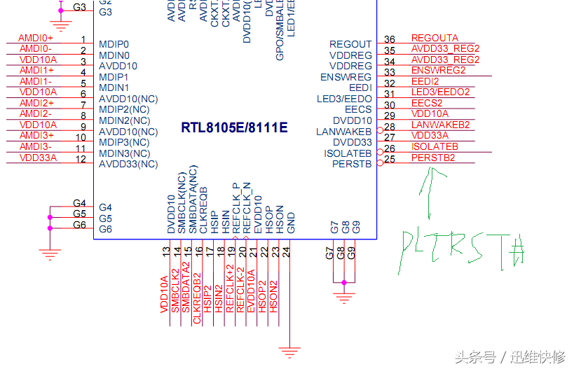 第9步,重新量测网卡上第25PIN仍然是无PLTRST信号啊。此板所有供电均已OK了,包括1.8VPLL锁相环供电----1.8V也OK了。