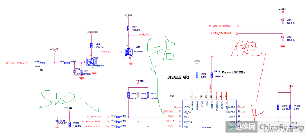 此电源芯片为PU7ISL95833,查芯片第2221脚VCCP与VDD上+V5S供电输入OK,查第2脚VR_ON开启信号为0V,主板断电后打此信号阻值320欧正常。附实物和原理图如下:EN信号由+1.05V_PWRGD经VQ2VQ1管子转换而来。示波器量VR530欧电阻为0V电压,原来是工控主板南桥与CPU总线供电无引起的无CPUVOREEN信号。