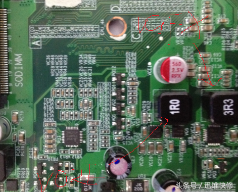 第二步,先用万用表量测主板上各供电信号对地二极体值。明细如下:PQ12+V12S供电,PL4电感内存供电,VL2电感CPUVORE供电,VL3电感CPU显卡供电。