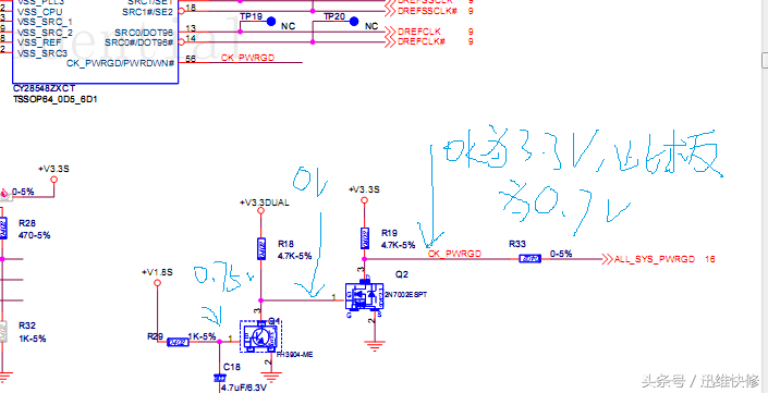 电路工作原理分析如下:+锁相环供电由PR291K电阻上拉,经/6.3V滤波和充放电后,延时产生0.75V电压,给到Q139N04三极管第一脚,使Q1管子完全导通,从而Q27002MOS管G级为低电平而截止。+电压经上拉电阻产生3.3V高电平,经0欧电阻R33给到时钟芯片56脚。