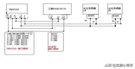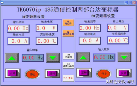 2,通过COM2口RS485与2台达VFD变频器建立连接由于TK6070IP与变频器采用